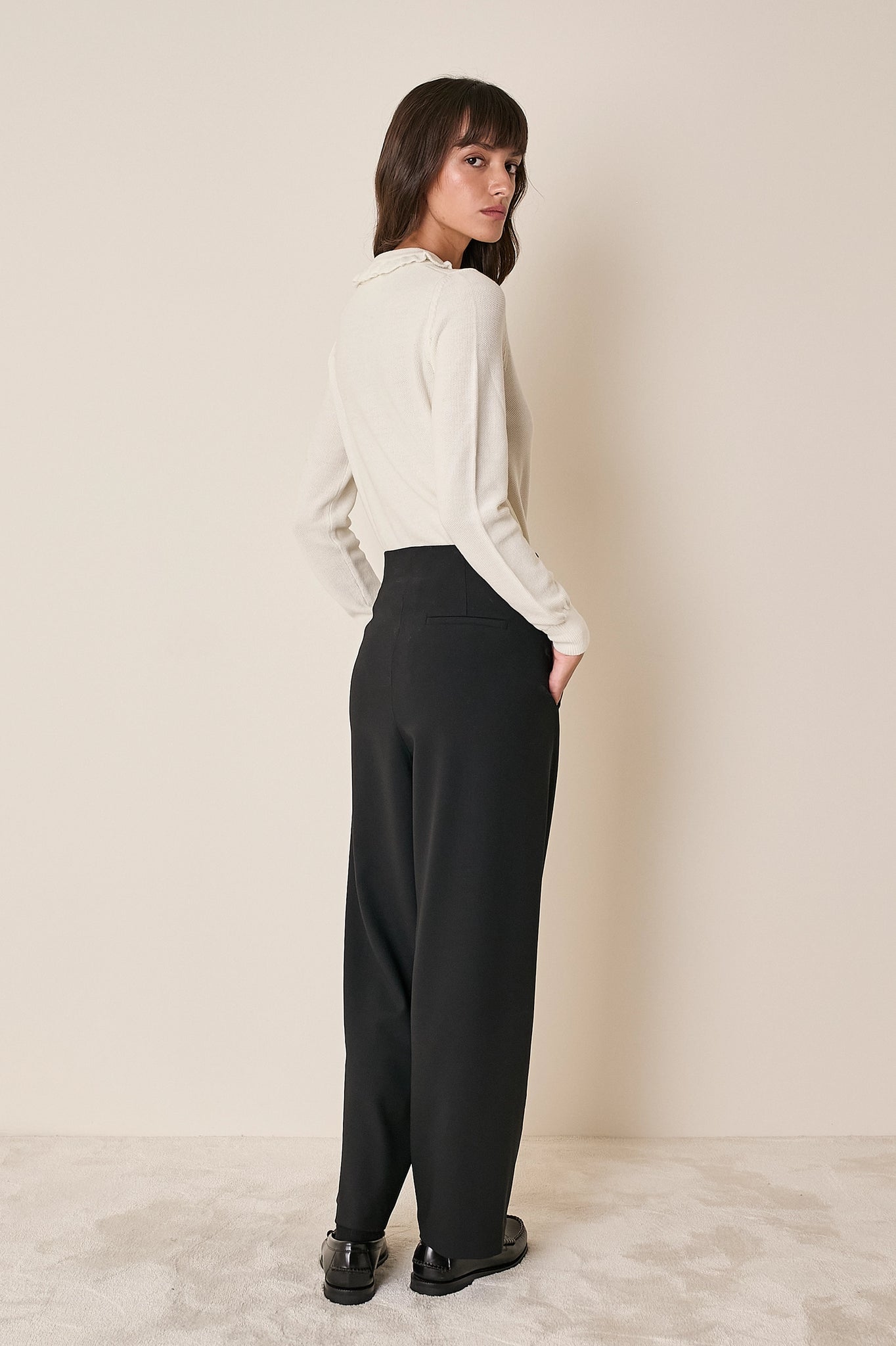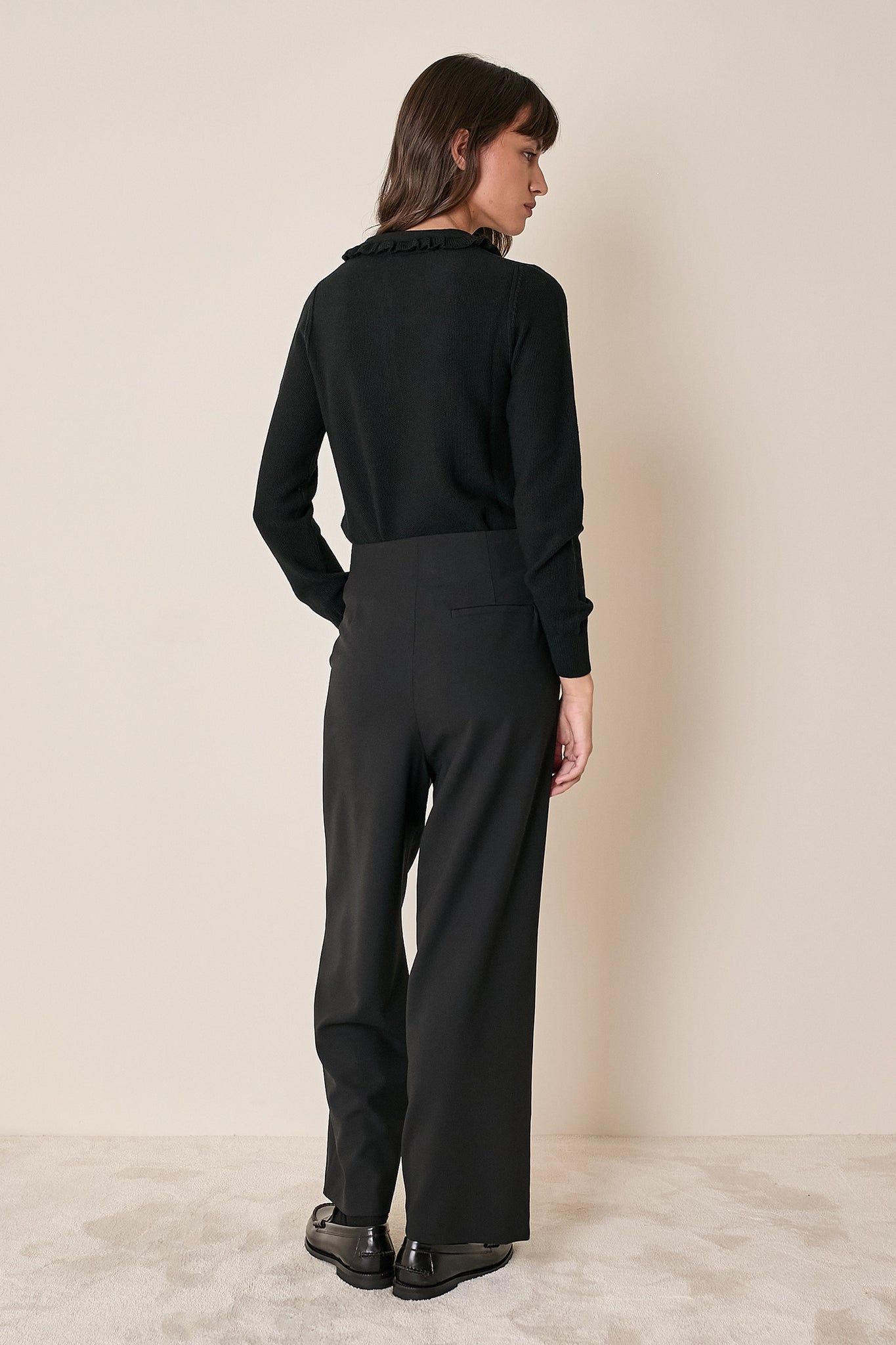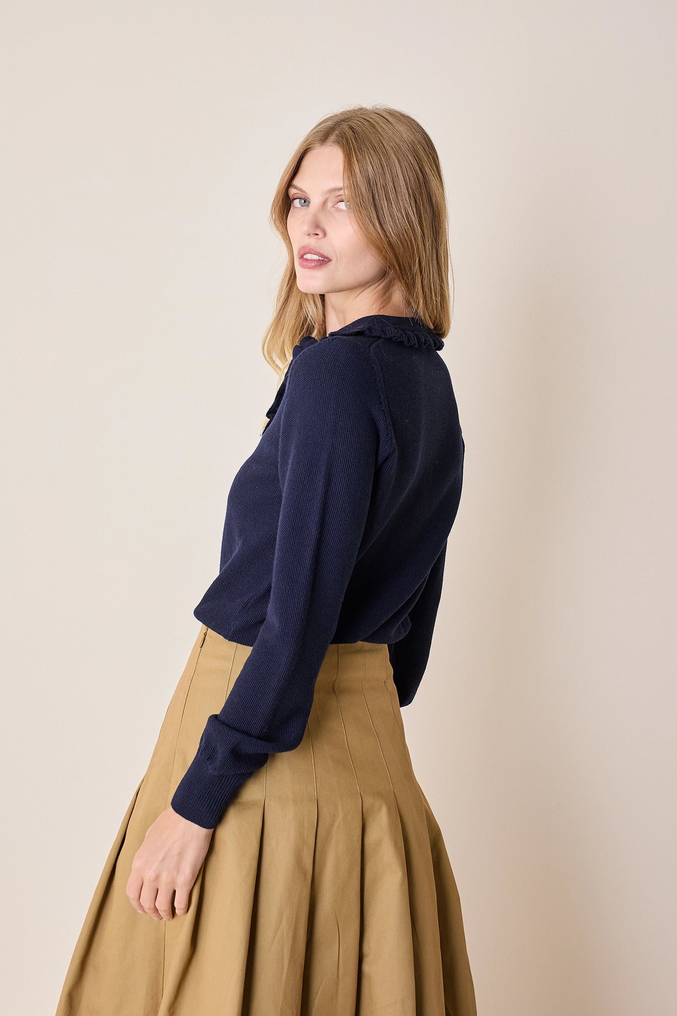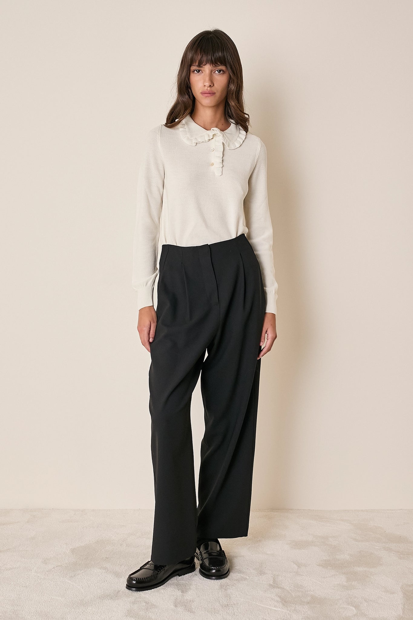 La polo, alla nostra maniera. Per questa polo abbiamo scelto un dettaglio romantico: piccoli volant che arricchiscono colletto e abbottonatura. Realizzata in lana merino extrafine, è disponibile in panna, grigio, nero o blu.