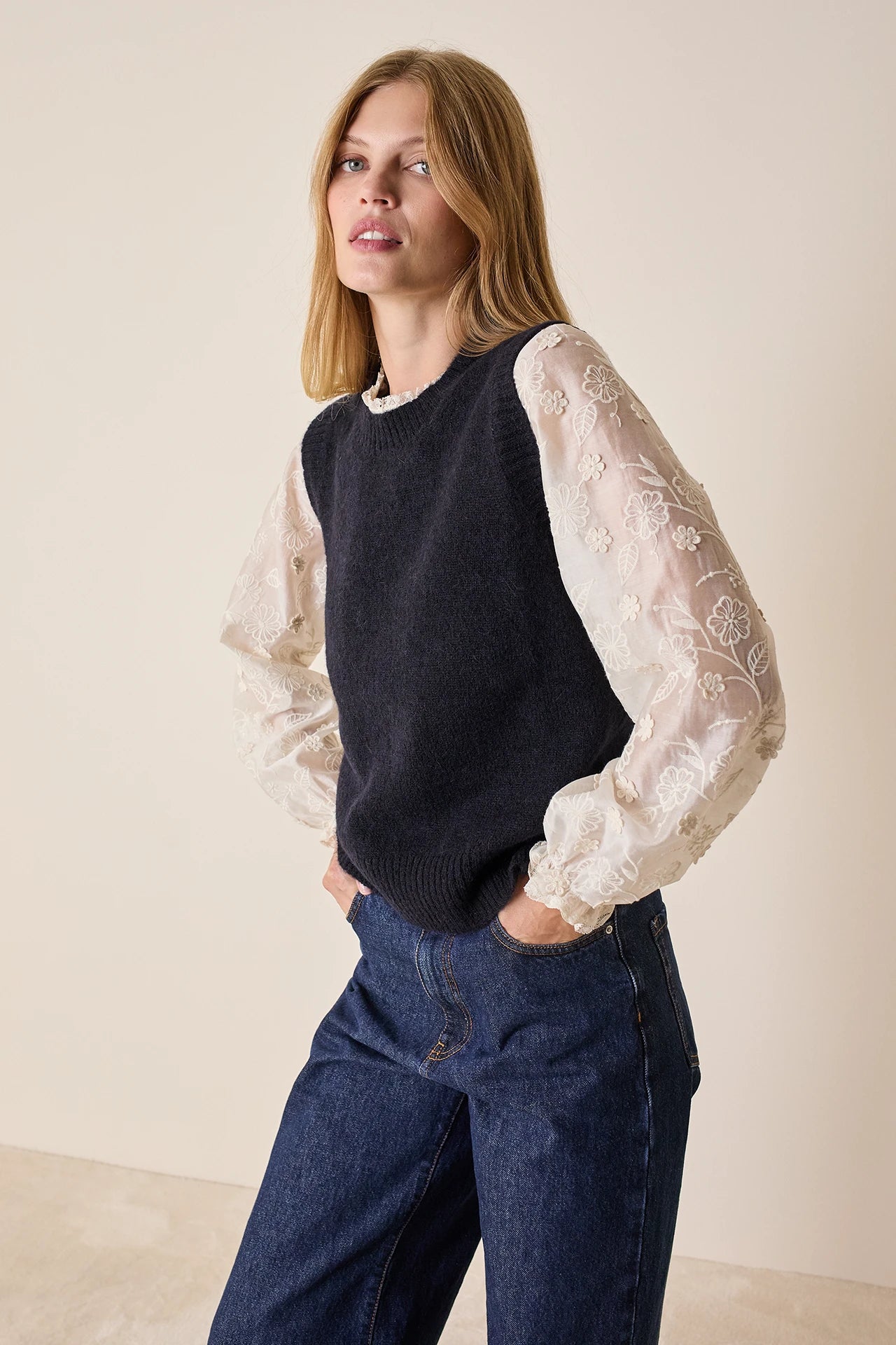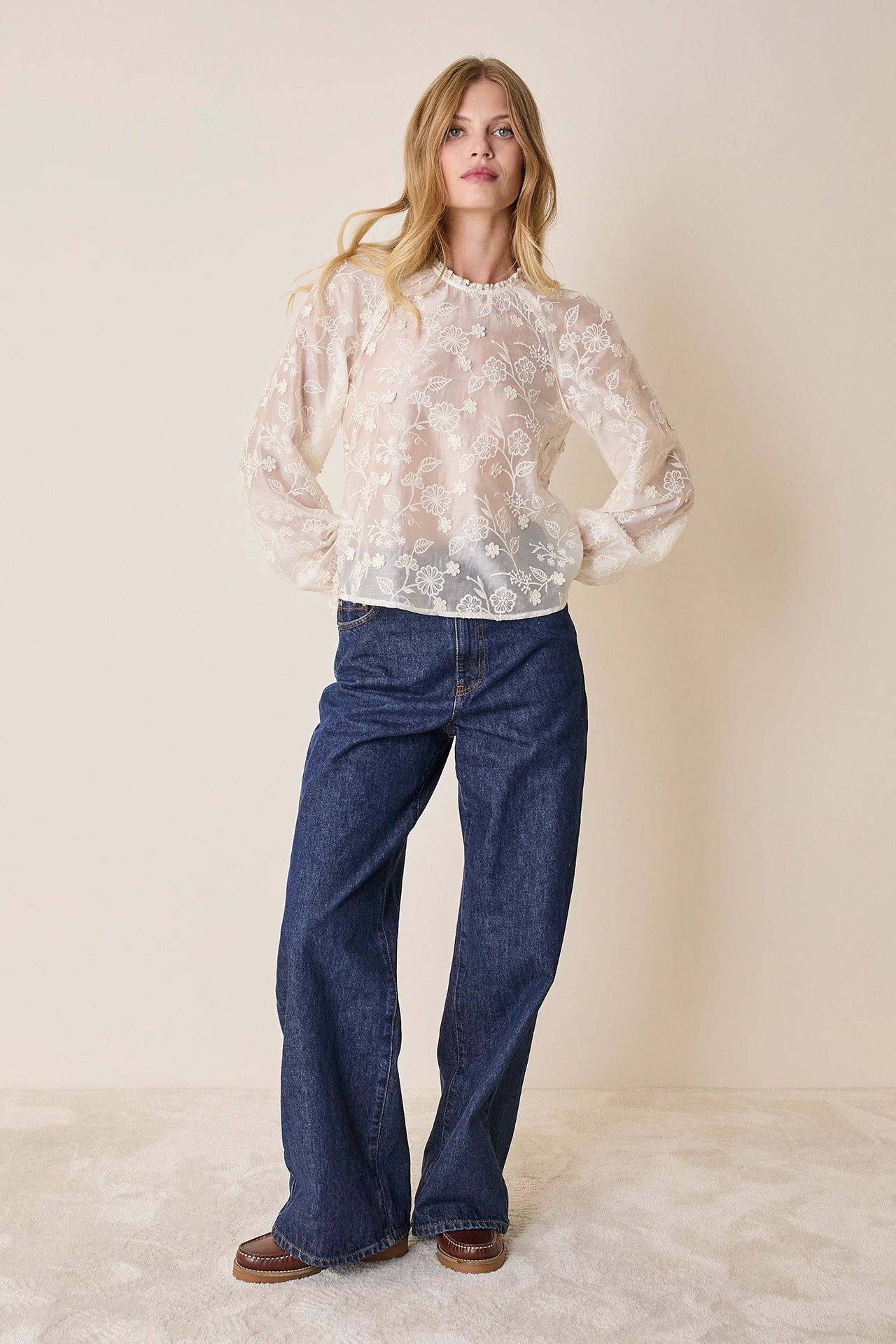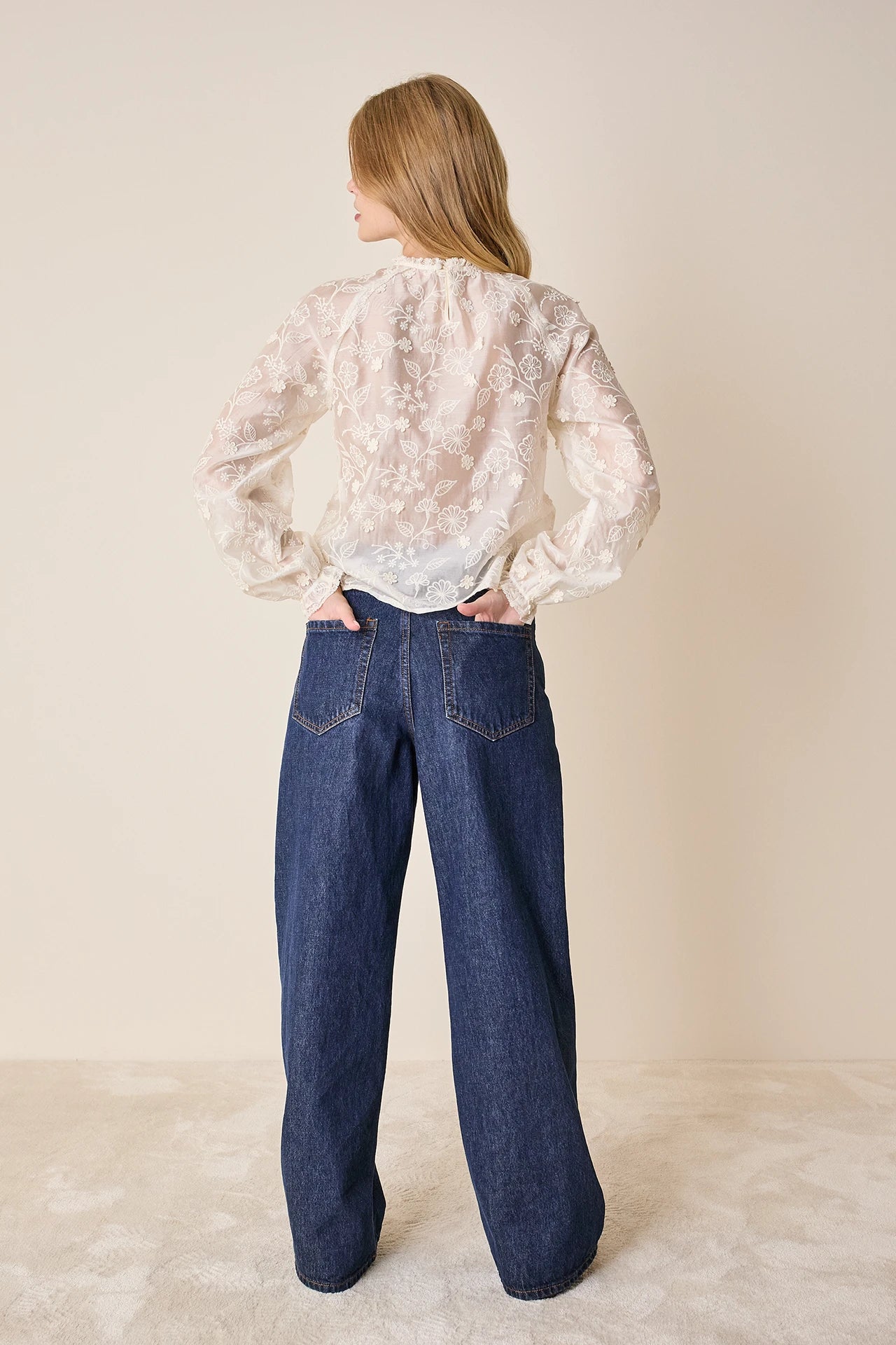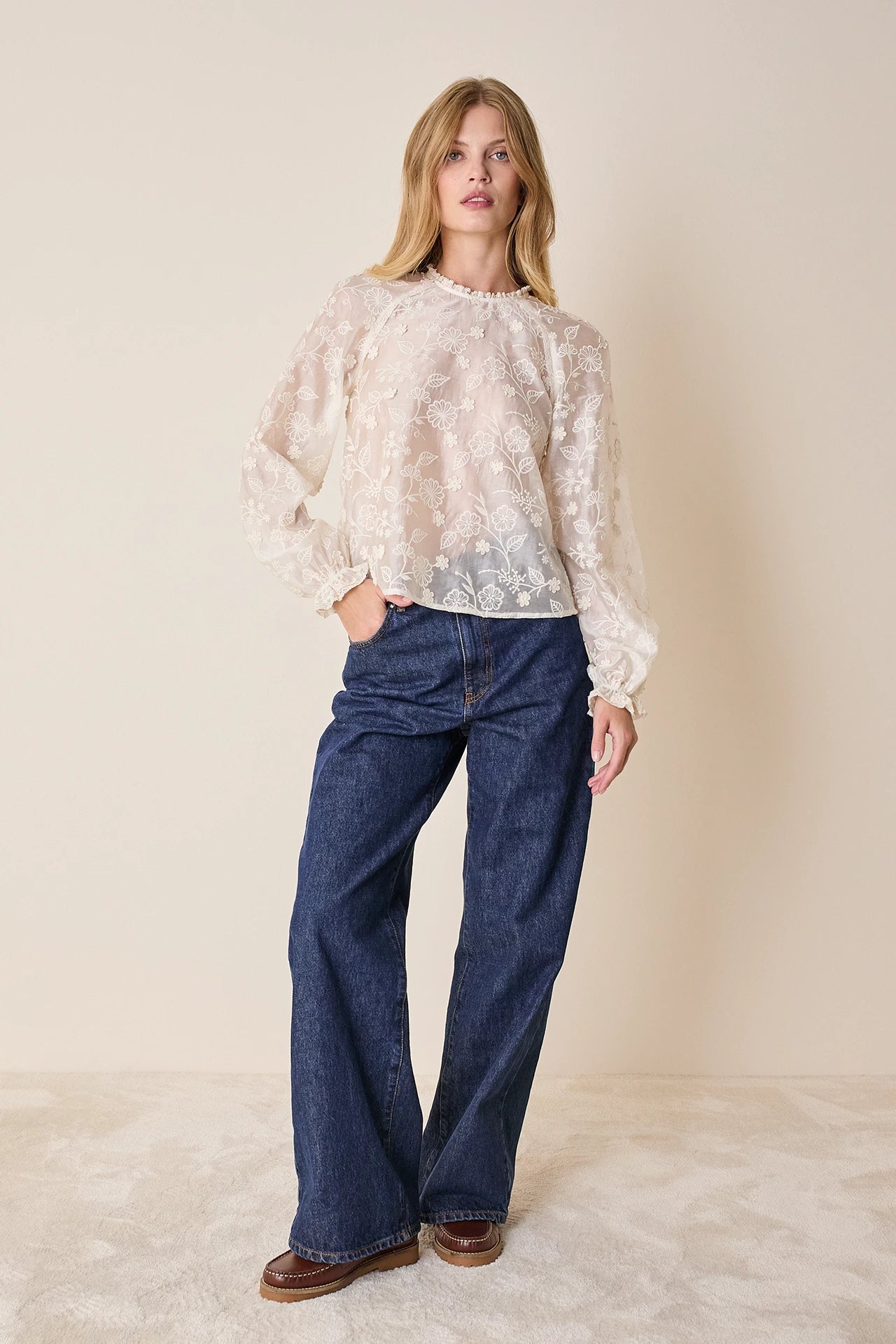 Per realizzare il top più romantico della stagione abbiamo scelto un pregiato tessuto ricamato con un delicato motivo floreale tono su tono. La sua particolarità? Grazie a una tecnica esclusiva ricami classici si alternano a fiori in rilievo, creando un delicato effetto tridimensionale. Colletto, maniche e polsini sono impreziositi da una passamaneria macramé, mentre il taglio raglan delle maniche – un elemento che si incontra solitamente su capi sportivi – introduce una contrapposizione moderna con lo stile classico del top.