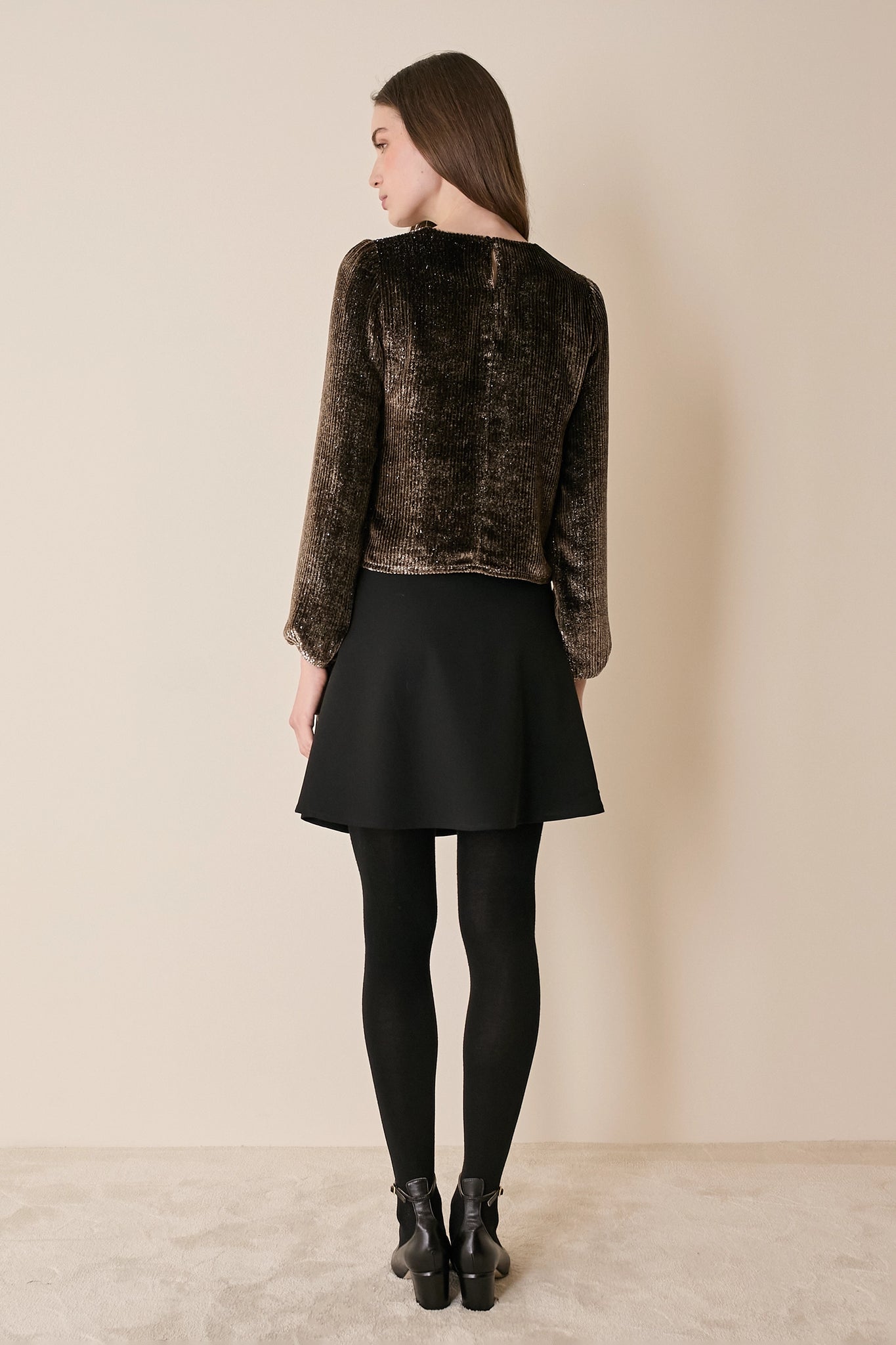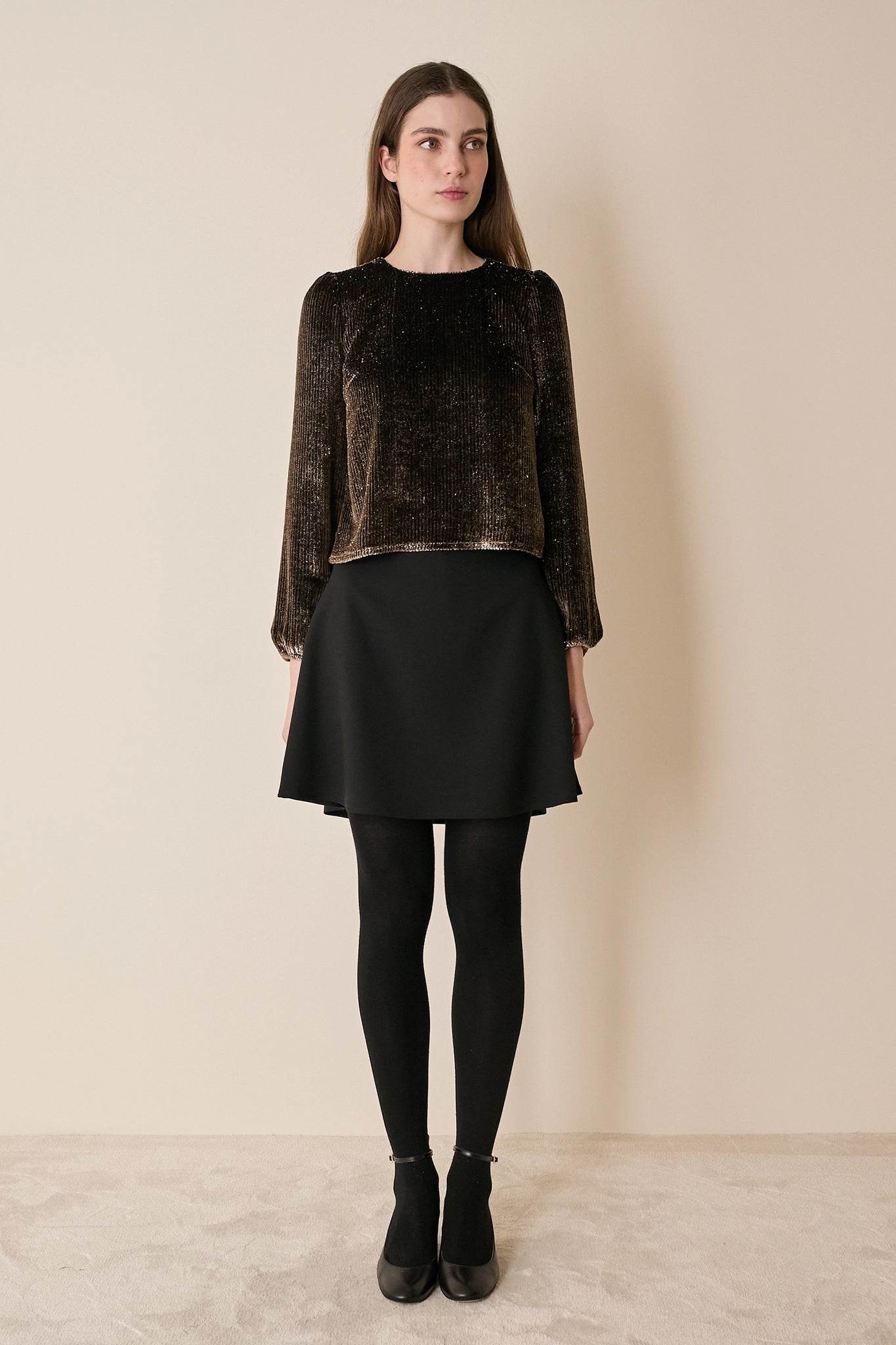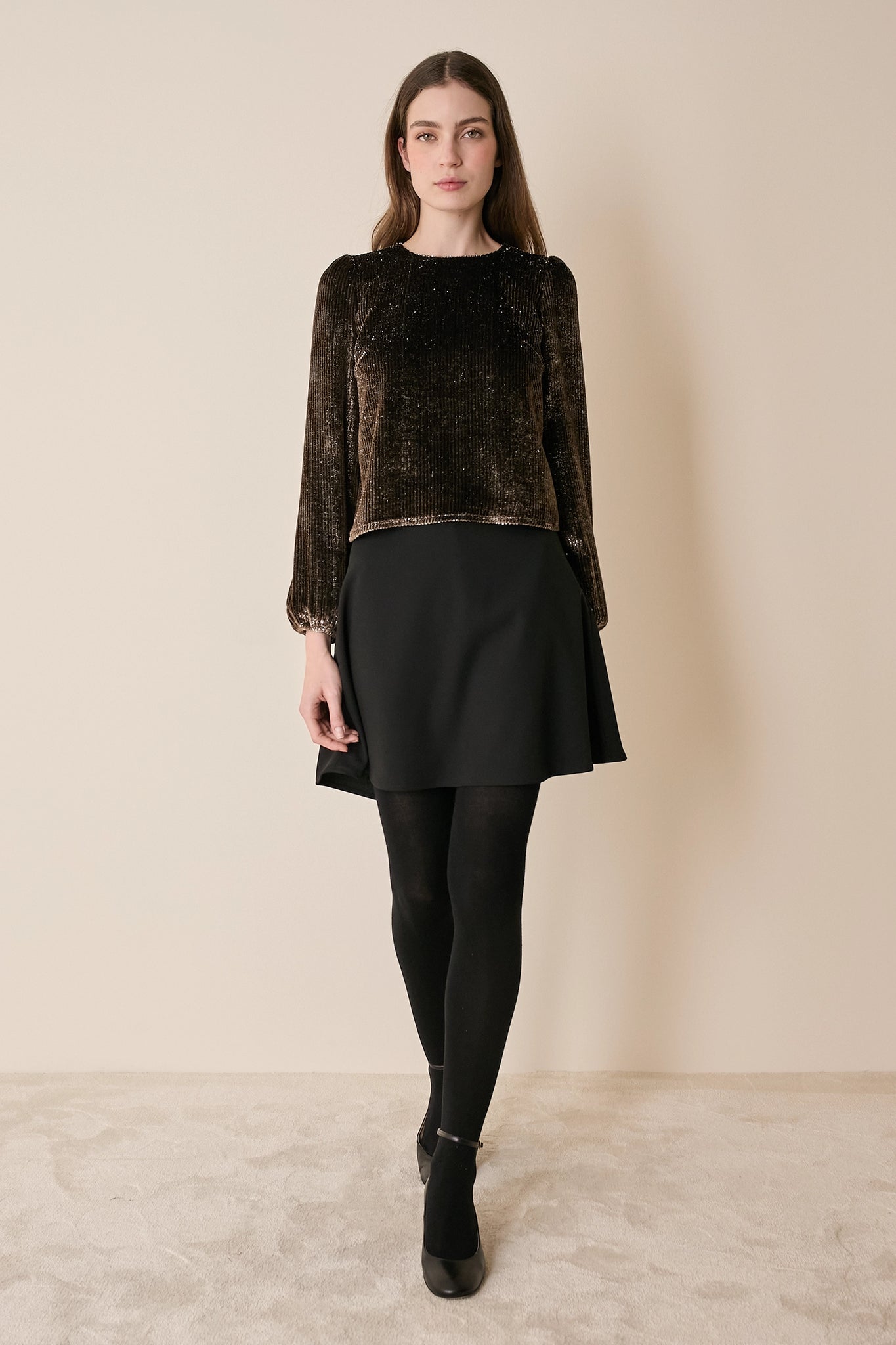 Per questo top abbiamo scelto un blend di seta con una lavorazione effetto spugnetta e un filo di lurex che illumina delicatamente il tessuto. Perfetto sia con una gonna che con un paio di jeans, sarà il nostro go-to per le feste. Disponibile in marrone.