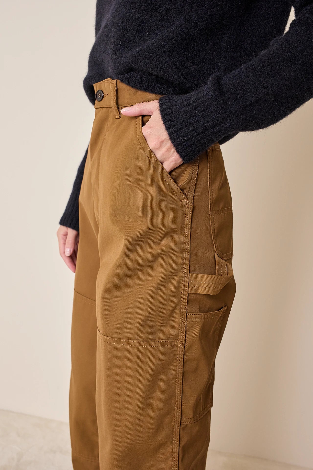 Questi pantaloni ispirati al workwear sono perfetti per l’autunno e la primavera. Realizzati in puro cotone, sono dotati di sei tasche per un look funzionale e utility. Disponibili in marrone biscotto.